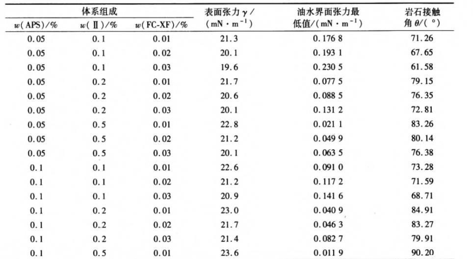 從圖4和圖5中也可以看出,當(dāng)Ⅱ型潤濕劑質(zhì)量分?jǐn)?shù)為0.2%、APS質(zhì)量分?jǐn)?shù)在0.05%~0.20%之間、FC-XF質(zhì)量分?jǐn)?shù)在0.01%~0.03%之間時(shí)混合體系具有更高的界面活性。因此,選擇APS質(zhì)量分?jǐn)?shù)為0.05%、0.10%和0.20%,Ⅱ型潤濕劑質(zhì)量分?jǐn)?shù)為0.1%、0.2%和0.5%,F(xiàn)C-XF質(zhì)量分?jǐn)?shù)為0.01%、0.02%和0.03%進(jìn)行三因素三水平的正交實(shí)驗(yàn),考察APS/Ⅱ/FC-XF混合體系的界面性能及與巖石的接觸角,結(jié)果如表1所示。
