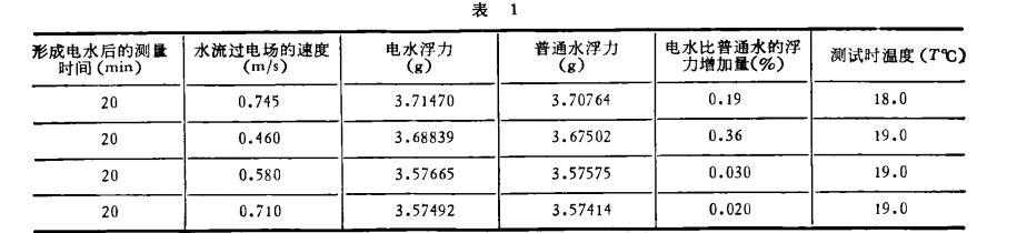 用自制電水器形成電水,用精度為0.1mg的電光天平測(cè)定電水和普通水的浮力。實(shí)驗(yàn)用水是長(zhǎng)春市自來水和深井水,測(cè)試時(shí)只要保證水溫和環(huán)境溫度穩(wěn)定,數(shù)百次實(shí)驗(yàn)證實(shí),電水浮力比普通水浮力增加,重復(fù)性規(guī)律較好?,F(xiàn)選四組數(shù)據(jù)列于表1。