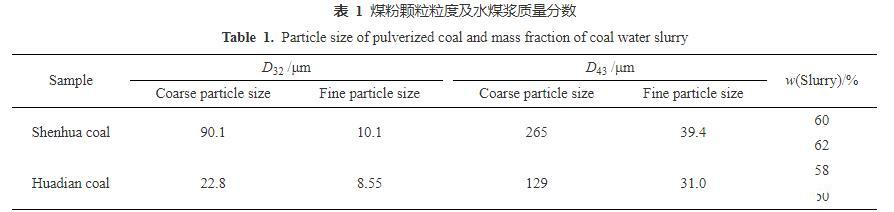 首先將破碎好的煤樣在105℃和通風條件下烘干2 h,然后放入磨機研磨30 min,最后在振篩機上進行篩分,得到粗、細兩種粒級煤粉,分別稱作粗顆粒和細顆粒。采用Mastersizer 2000激光粒度儀測試了煤粉的粗、細顆粒粒度,分別如表1和圖1所示。制備的粗、細兩種煤粉顆粒存在著一定的粒度分布,因此選取平均直徑來表示其粒度特性。在燃燒、氣化和噴嘴霧化等應用中,常選取索特平均直徑(D32)或德布魯克平均直徑(D43)作為平均直徑。采用干法制漿,配制時粗、細煤顆粒的質量比為6∶4,分別稱取一定質量的烘干后的煤粉和去離子水以及分散劑(煤粉質量的1%),并用攪拌器在1000 r/min的轉速條件下攪拌15 min進行制漿。不同濃度的水煤漿會呈現出不同的黏度和表面張力等特性,這些參數會對水煤漿微觀破裂產生顯著影響,所以本文選擇了實際氣化生產中常見的質量分數為58%~62%的水煤漿為研究對象。