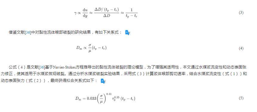 公式(4)是文獻(xiàn)基于Navier-Stokes方程推導(dǎo)出的黏性流體破裂的理論模型,為了增強(qiáng)其適用性,本文通過水煤漿流變性和動(dòng)態(tài)表面張力修正,使其適用于水煤漿微觀破裂。通過分析水煤漿破裂實(shí)驗(yàn)結(jié)果,采用式(3)計(jì)算漿體喉部剪切速率,結(jié)合水煤漿流變性(式(1))和動(dòng)態(tài)表面張力(式(2)),最終獲得擬合關(guān)系式如下: