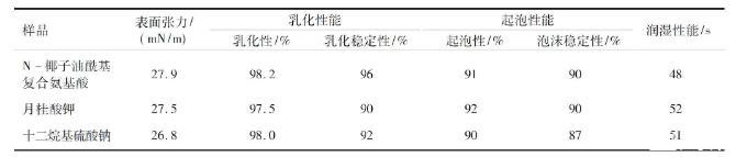 測(cè)定了以大豆粕為原料合成的N-椰子油酰基復(fù)合氨基酸產(chǎn)物表面活性性能,同時(shí)與陰離子表面活性劑月桂酸鉀、十二烷基硫酸鈉表面活性進(jìn)行了比較,結(jié)果見表4。