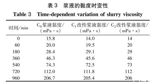 3種漿液在23℃條件下黏度隨時(shí)間變化關(guān)系見表3。可以看出:3種漿液的黏度均隨時(shí)間的增長(zhǎng)而逐漸變大,表面活性劑對(duì)漿液的初始黏度以及不同時(shí)間的黏度影響很小(最大變化≤1.8mPa·s)。說明加入表面活性劑對(duì)漿液的黏度變化無影響。