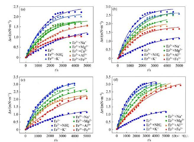 本文根據離子型稀土礦原地浸礦液的成分組成,選擇NH4+、Na+、K+、Mg2+、Ca2+、Al3+、Fe3+等離子為共存陽離子的代表,Er3+離子作為鑭系重稀土的代表。采用LB膜技術測定不同種類陽離子與稀土Er3+離子共存時的P507 分子單層Δπ?t 曲線,研究水溶液中與稀土離子共存的不同種類陽離子的競爭擴散和吸附行為對稀土離子與P507 分子相互作用的影響規律。通過動態界面張力實驗表征、結合分子動力學模擬,解釋了共存陽離子競爭吸附影響稀土萃取分離選擇性的界面鹽效應及其作用機制。