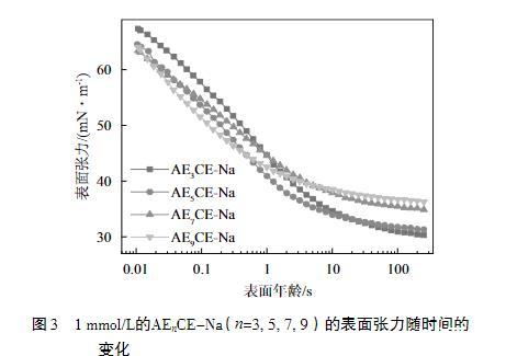 前面已經討論了溶液平衡時的特性與規律,但沒有考慮平衡及老化的時間,而時間因素在實際應用中起著決定性的作用。當表面活性劑分子從本體相遷移到表面時,分子的動態吸附性能會影響表面活性劑的性能。因此,如圖3所示,測試了1 mmol/L的不同EO加合數的AEnCE-Na的表面張力隨時間的變化曲線。