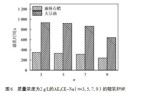 表面活性劑的另一大用途是通過降低油/水界面的界面張力而用作乳化劑,穩定存在的乳液被廣泛應用于食品、藥品和個人護理等方面。因此,測試了不同EO加合數的AEnCE-Na對大豆油和液體石蠟的破乳時間,結果如圖6所示。
