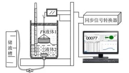 圖1為自制2種液體間界面張力的動態實時測量裝置圖,該儀器主要包括電腦顯示器、同步信號轉換器、自制實驗架臺、力敏傳感器、金屬吊環、恒溫杯、溫度計、排液孔、排液管、流速調節器和儲液槽等組成.