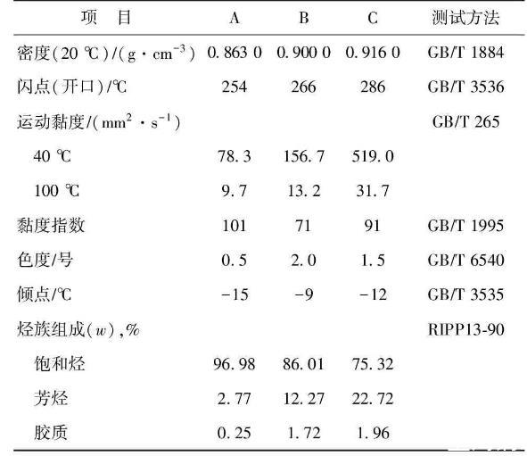 一般情況下,界面活性由小到大的順序為:飽和烴<芳烴<膠質。重芳烴及膠質組分中的極性物質具有較強的界面活性,它們的存在可以降低油品與水的界面張力,使油品容易乳化。且復合劑的加入進一步降低了油水的界面張力,導致油品乳狀液穩定性增強,其分水性變差。加入的復合劑可能與油品中所含芳烴和膠質等極性化合物結合,導致基礎油分水性更差。所以基礎油中所含極性組分越多,其與加入的復合劑結合的程度就越強,導致基礎油的分水性越差。結合表1進行分析可知:基礎油A的黏度最小,且芳烴和膠質等極性化合物含量最少,其分水性最好;基礎油C的黏度最大,且芳烴和膠質等極性化合物含量最高,其分水性最差;基礎油B的黏度和極性組分含量比A大、比C小,其分水性能介于A與C之間。