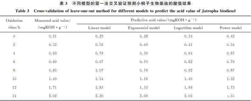 留一法交叉驗證是建立預(yù)測模型的一種常用方法,從N個觀測數(shù)據(jù)中選擇一個觀測數(shù)據(jù)作為驗證數(shù)據(jù),然后使用剩下的(N-1)個觀測數(shù)據(jù)擬合一個模型,并用驗證數(shù)據(jù)來驗證模型的精度,如此重復(fù)N次。考慮到數(shù)據(jù)量以及相關(guān)性,筆者利用Excel建立了線性、指數(shù)、對數(shù)、乘冪4種預(yù)測模型,對小桐子生物柴油酸值的預(yù)測結(jié)果見表3。