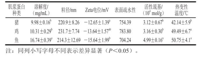 表2不同種類肉肌漿蛋白理化指標的測定結果