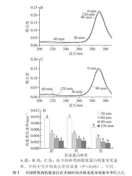 圖1不同種類肉肌漿蛋白在不同時間點(diǎn)吸光度及構(gòu)象速率的變化