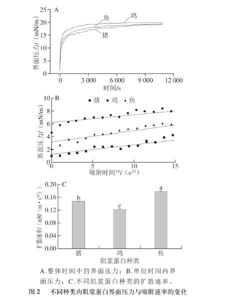 由圖2可知,不同種類肌漿蛋白的動力學(xué)擴(kuò)散速率間存在差異性。蛋白質(zhì)分子在界面上的擴(kuò)散速率受其粒徑大小的影響,而本實(shí)驗(yàn)結(jié)果更能解釋這一現(xiàn)象。在前述理化指標(biāo)中,粒徑大小為雞肉肌漿蛋白>豬肉肌漿蛋白>魚肉肌漿蛋白,而在本部分?jǐn)U散速率大小為雞肉肌漿蛋白<豬肉肌漿蛋白<魚肉肌漿蛋白。這可能是由于大粒徑的肌漿蛋白產(chǎn)生的空間位阻在一定程度上削弱了表面疏水性提高帶來的吸附速率增加。而且魚肉肌漿蛋白的擴(kuò)散速率較豬肉和雞肉肌漿蛋白間顯著較大(P<0.05),但雞肉與豬肉肌漿蛋白之間的擴(kuò)散速率卻無顯著性差異(P>0.05)。
