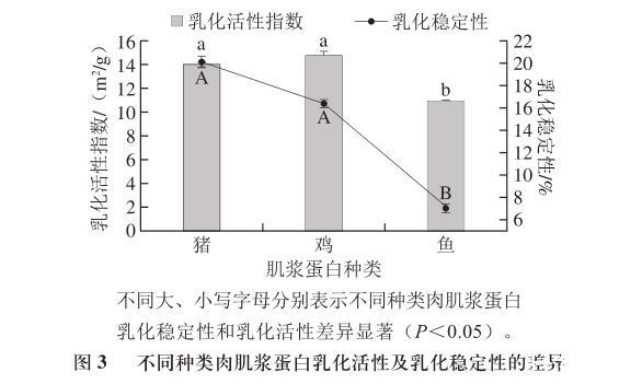 實(shí)驗(yàn)結(jié)果還表明,雞肉肌漿蛋白乳化活性最高,魚肉肌漿蛋白乳化活性顯著低于豬肉和雞肉肌漿蛋白,豬肉肌漿蛋白乳化活性稍低于雞肉但無顯著差異性,這可能是由于肌漿蛋白粒徑及構(gòu)象的不同造成的。但魚肉肌漿蛋白的乳化穩(wěn)定性顯著最差。
