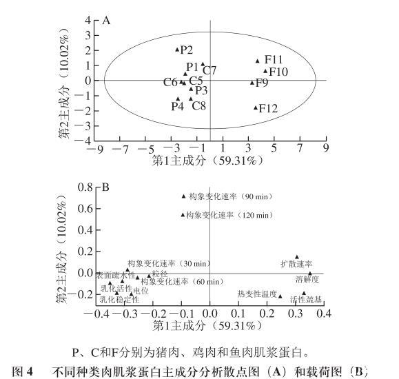 由于測量指標(biāo)間存在線性相關(guān)性,單一的指標(biāo)不能更清楚地反映出不同種類肉肌漿蛋白間的差異性,因此進(jìn)一步進(jìn)行主成分分析。由圖4A可知,第1主成分占59.31%,第2主成分占10.02%,總共占比69.33%,其中樣本F10、F11以及F12對第1主成分貢獻(xiàn)率較大,且與第1主成分呈正相關(guān),而C7樣本對第2主成分貢獻(xiàn)率較大且呈正相關(guān)。由圖4B可知,肌漿蛋白的擴(kuò)散速率、溶解度、乳化活性、乳化穩(wěn)定性、表面疏水性、電位、構(gòu)象在30 min及60 min時的變化速率對第1主成分貢獻(xiàn)率較大,其中擴(kuò)散速率和溶解度與第1主成分呈正相關(guān),而除此以外的其他指標(biāo)與第1主成分呈負(fù)相關(guān)。而蛋白的構(gòu)象在90 min以及120 min時的變化速率對第2主成分的貢獻(xiàn)率較大。圖中的乳化活性、表面疏水性、乳化穩(wěn)定性及電位間距離較近,說明這些指標(biāo)間存在一定的相關(guān)性。綜合前述的研究結(jié)論可知肌漿蛋白的乳化活性和乳化穩(wěn)定性與其表面疏水性、電位和構(gòu)象變化速率有較強(qiáng)的相關(guān)性,而擴(kuò)散速率與溶解度間相關(guān)性較強(qiáng)。