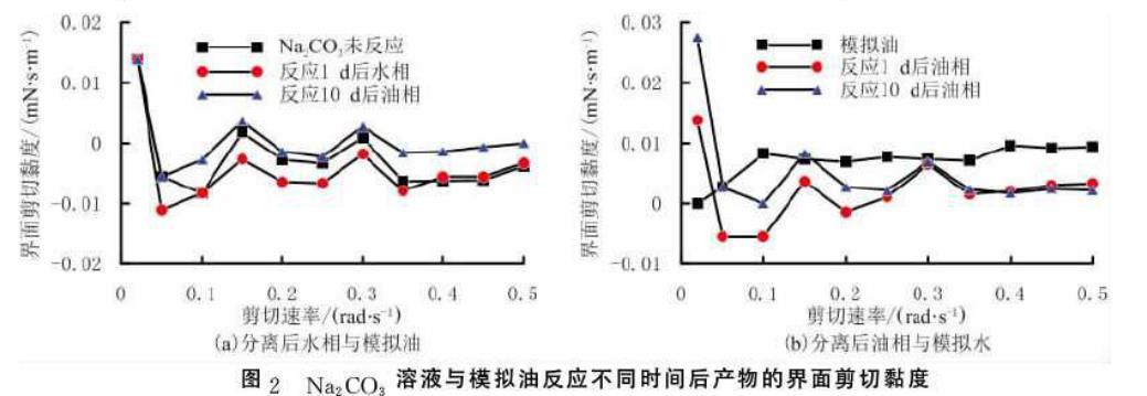 在Na2CO3溶液與模擬油反應1d和10d后,分離得到的水相與模擬油及油相與模擬水的界面剪切黏度隨剪切速率變化關系見圖2.由圖2可以看出,Na2CO3溶液與模擬油反應1d及10d后,分離得到的水相與模擬油的界面剪切黏度,與未反應Na2CO3溶液與模擬油的界面剪切黏度相比變化不大;模擬油與Na2CO3溶液反應1d及10d后,分離得到的油相與模擬水的界面剪切黏度與模擬油與模擬水間的界面剪切黏度相比變化不大,表明Na2CO3溶液與模擬油反應后分離出的水相和油相對油水界面剪切黏度影響不大。原因是模擬油中的有機酸組分與Na2CO3溶液反應所生成的,無論是水溶性還是油溶性的界面活性物質均較少,在油水界面處的吸附不足以引起油水界面剪切黏度的變化。