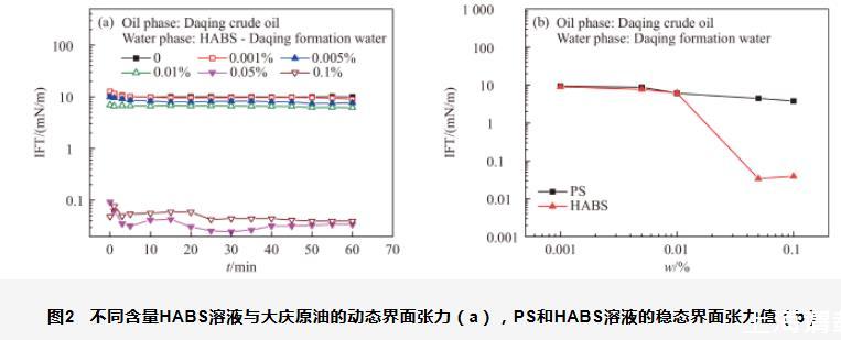 圖1不同含量HABS溶液與癸烷的動態界面張力(a),PS和HABS溶液的穩態界面張力值(b)