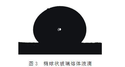 將制備的玻璃樣塊用錫紙包裹,用鐵錘捶碎后用鉗子修整成較方正的顆粒,選取內(nèi)部無(wú)氣泡結(jié)石且質(zhì)量為0.15~0.30g的碎塊用于測(cè)試。測(cè)試前選用T4溫度表面張力為334 mN/m的標(biāo)準(zhǔn)鈉鈣玻璃校準(zhǔn)表面張力測(cè)量?jī)x。測(cè)試的具體操作步驟如下:將表面張力測(cè)量?jī)x加熱爐升溫至測(cè)量溫度,通入高純氮?dú)庾鳛楸Wo(hù)氣體,然后將制備好的玻璃樣品置于石墨片上,送入加熱爐中的樣品臺(tái)上進(jìn)行保溫,試樣在表面張力作用下收縮成橢球狀液滴,如圖3所示,將液滴置于拍攝裝置視野中心,保溫30 min至熔體穩(wěn)定。隨后,用圖像采集裝置獲取橢球熔體的外輪廓線,通過(guò)軟件數(shù)值分析得到輪廓參數(shù),利用Young-Laplace方程進(jìn)行解析,計(jì)算出樣品的表面張力(σ),反復(fù)測(cè)試若干次后取σ的平均值為樣品在該測(cè)試條件下的表面張力值。