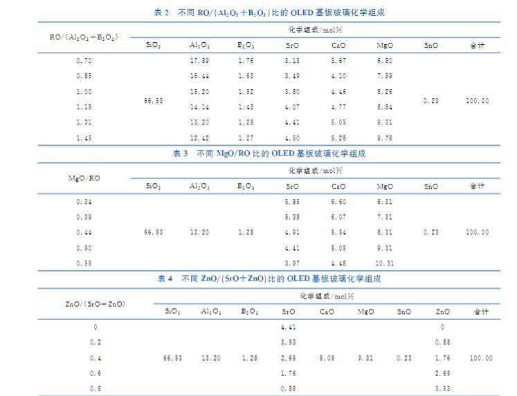 根據(jù)開(kāi)發(fā)需求,本文設(shè)計(jì)了四組不同化學(xué)組成的OLED基板玻璃。如表1~表4所示,分別通過(guò)改變組成中的Al?O?/SiO?、RO/(Al?O?+B?O?)、MgO/RO和ZnO/(SrO+ZnO),研究表面惰性組分和表面活性組分的相對(duì)含量,以及同堿土金屬氧化物網(wǎng)絡(luò)作用相似但活性更強(qiáng)的過(guò)渡金屬氧化物對(duì)無(wú)堿鋁硅酸鹽玻璃表面張力的影響。
