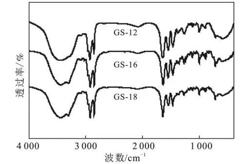 根據(jù)方案1的合成路線,成功制備了3種以1,4-二溴-2-丁烯為連接基團(tuán)的酰胺基Gemini表面活性劑。利用紅外和核磁對(duì)酰胺基Gemini表面活性劑GS-12,GS-16,GS-18進(jìn)行結(jié)構(gòu)表征,結(jié)果見(jiàn)圖1和圖2。