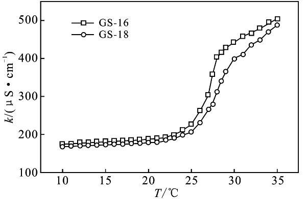 2.2.1 Krafft溫度Krafft溫度影響表面活性劑溶解度,表面活性劑在此溫度以上可以形成膠束。在Krafft溫度以下,以單分散的表面活性劑與水化固體表面活性劑的狀態(tài)存在,而在Krafft溫度以上,水化固體表面活性劑的溶解和膠束形成也參與了平衡[9-10]。質(zhì)量分?jǐn)?shù)1%表面活性劑GS-12,在室溫可以完全溶解,將其溶液置于冰水混合物中1周,溶液仍然澄清透明,沒(méi)有渾濁的跡象。表明GS-12的Krafft溫度低于0℃。通過(guò)測(cè)量電導(dǎo)率可以得到Krafft溫度的近似值,由圖3可知,GS-16,GS-18的Krafft溫度分別為27,27.5℃。k值在較低溫度下緩慢增加,這是由于離子表面活性劑的溶解度有限。隨著溫度的進(jìn)一步升高,Krafft溫度處的k值急劇增加。k值的增加是由于膠束的形成,水合表面活性劑的溶解度突然增加,直至達(dá)到克拉夫特溫度。此外,離子遷移率增加隨著溫度增加、k逐漸增加[3,10]。結(jié)果表明,Gemini表面活性劑的Krafft溫度隨表面活性劑的疏水鏈長(zhǎng)的增加而升高。