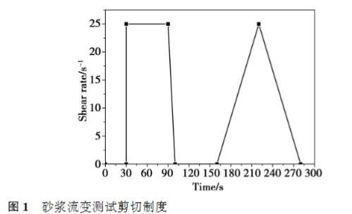 砂漿的流變測試使用Brookfield R/S SST2000流變儀,將測試流動度之后的砂漿立即置于流變儀中,選定設置好的剪切制度后開始測試,剪切制度設置如圖1所示。具體過程描述如下:靜置30s后,在剪切速率25s?1下勻速預剪切60s;然后剪切速率在10s內勻速下降至0s?1;靜置60s后,剪切速率以斜坡式在60s內逐漸從0s?1提高至25s?1,然后再以斜坡式在60s從25s?1下降到0,采集60個數據點。采用剪切速率從25s?1下降到0s?1的過程中的屈服應力和表觀黏度作為分析砂漿流變性能的數據。