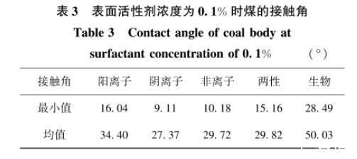 以接觸角作為判斷潤濕的標(biāo)準(zhǔn),接觸角越小則潤濕性能越好。表面活性劑濃度為0.1%時(shí),煤巖接觸角統(tǒng)計(jì)結(jié)果見表3。當(dāng)活性劑水溶液濃度為0.1%時(shí),陰離子表面活性劑AES水溶液與煤的接觸角最小為9.11°。進(jìn)一步將不同類型表面活性劑水溶液在濃度為0.1%時(shí)與煤的接觸角進(jìn)行均值化處理可發(fā)現(xiàn),陽離子、陰離子、非離子、兩性及生物表面活性劑水溶液與煤的接觸角平均值分別為34.4°、27.37°、29.72°、29.82°和50.03°。因此,表面活性劑潤濕性效果排序?yàn)椋宏庪x子表面活性劑>非離子表面活性劑>兩性表面活性劑>陽離子表面活性劑>生物表面活性劑。