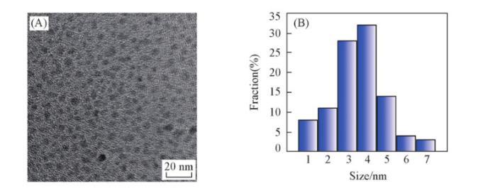 通過傅里葉變換紅外光譜(FTIR)、透射電子顯微鏡(TEM)和X射線衍射(XRD)對DA-GQD的結(jié)構(gòu)進(jìn)行表征。從FTIR譜圖(圖S1,見本文支持信息)可知,DA-GQD可能包含C—H,O—H,O═C(R)—和C—N基團(tuán)。從TEM和粒徑分布圖(圖2)可以看出,DA-GQD顆粒比較均勻,基本上為橢球形納米顆粒,粒徑主要分布在1~7 nm,平均粒徑約為3.5 nm。XRD譜圖(圖S2,見本文支持信息)中在20°左右有一個(gè)較寬的峰,說明合成的DA-GQD具有石墨烯結(jié)構(gòu)。