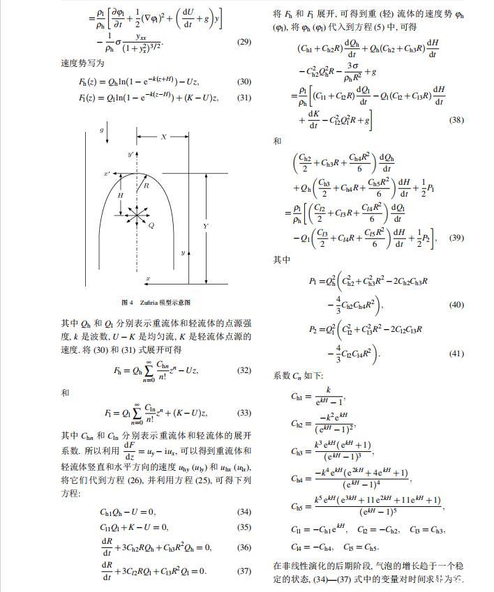 Layzer模型和Zufiria模型都是建立在理想流體之上。然而對實際流體而言,很多因素都可以影響RT不穩定性的演化情況,如密度比、黏性、界面張力、壓縮性、外場加速度、Kelvin-Helmholtz不穩定性等。Young和Sohn利用Goncharov提出的復雜速度勢,將Layzer模型推廣并應用到非理想流體中,研究了界面張力對RT不穩定性增長的影響,發現界面張力降低了氣泡的增長速率。2011年本文的作者之一利用Zufiria模型研究了黏性對RT不穩定性增長的影響。但是,目前沒有人利用Sohn提出的簡單速度勢的Layzer模型研究界面張力對RT不穩定性的影響,也沒有人利用Zufiria模型研究界面張力對RT不穩定性的影響。