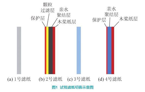 濾紙的切面結(jié)構(gòu)如圖1所示。1號濾紙為單層親水材料。2號濾紙由保護層a、顆粒過濾層b、親水聚結(jié)層c和木漿紙層d組成,木漿紙作為基層材料,c和d層、b與c層均由樹脂粘結(jié),a與b層通過超聲波焊接在一起。3號濾紙為聚四氟乙烯編織而成的單層網(wǎng)狀濾紙。4號濾紙由保護層a、疏水過濾層b和基層c組成,4號濾紙的粘結(jié)工藝與2號濾紙相同,保護層和疏水層由超聲波焊接在一起,基層和疏水層使用樹脂進行粘結(jié)。