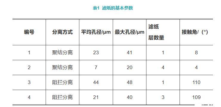 本試驗選擇4種具有代表性結(jié)構(gòu)的濾紙,測量其在不同振動條件下的油水分離效率,研究其變化規(guī)律,濾紙的基本參數(shù)如表1所示。1號和2號為聚結(jié)式濾紙,3號和4號為阻攔式濾紙。