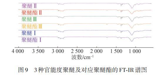 圖9為3種官能度的聚醚和聚醚酯FT-IR譜圖。由圖9可以看出,在3種官能度聚醚的FT-IR譜圖中,1 737 cm?1處均無(wú)特征峰,而3種官能度聚醚酯在1 737 cm?1處均有特征峰,為酯基C==O的吸收峰,說(shuō)明3種官能度聚醚末端的醇羥基已經(jīng)與脂肪酸發(fā)生反應(yīng)。2 971 cm?1處的特征峰表明有—CH?存在,2 857和1 455 cm?1處的特征峰表明存在—CH?—,1 296 cm?1處的特征峰則為—CH?的彎曲振動(dòng)峰,在1 097 cm?1處的C—O—C伸縮振動(dòng)峰較明顯,表明聚醚酯中醚鍵較多。