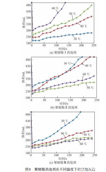 圖8為聚醚酯消泡劑在不同溫度下的消泡性能。