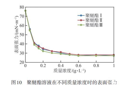 在室溫下,將聚醚酯配制成不同質(zhì)量濃度的水溶液,測(cè)試其表面張力,結(jié)果見圖10。由圖10可知,聚醚酯溶液的表面張力隨其質(zhì)量濃度的增高而下降,當(dāng)聚醚酯溶液的質(zhì)量濃度為0~0.2 g/L時(shí),聚醚酯溶液的表面張力下降較快,當(dāng)聚醚酯溶液的質(zhì)量濃度大于0.2 g/L時(shí),聚醚酯溶液的表面張力隨其質(zhì)量濃度的增加而下降較慢,3種官能度聚醚酯的表面張力下降趨勢(shì)基本一致,當(dāng)聚醚酯溶液的質(zhì)量濃度提高到0.6 g/L時(shí),3種聚醚酯溶液的表面張力均降至27.0 mN/m,說(shuō)明聚醚酯在較低的質(zhì)量濃度下可以快速降低表面張力,表面性能優(yōu)異。