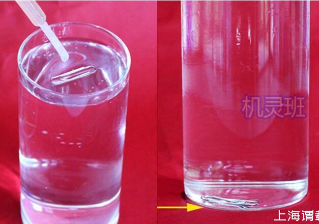 而當(dāng)你把洗潔精滴入水里,會破壞水的表面張力,使得水的表面張力不足以支撐回形針,因此回形針會下沉至玻璃杯的底部。