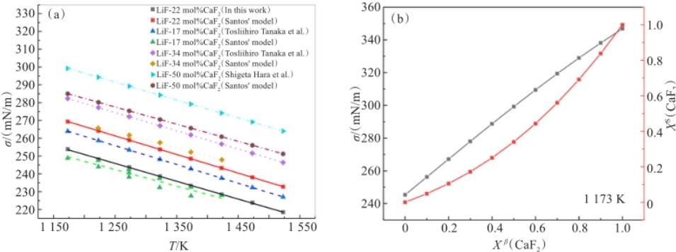圖2 LiF-CaF2熔鹽體系表面張力(a)實驗值與Santos模型計算值比較和(b)CaF2在表面相與體相含量關系
