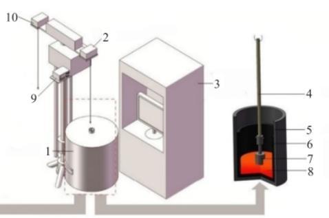 1.高溫爐;2.黏度儀;3.控制箱;4.剛玉套管;5.碳化硅坩堝;6.石墨坩堝;7.鎢制測頭;8.熔鹽;9.導電儀;10.天平儀。