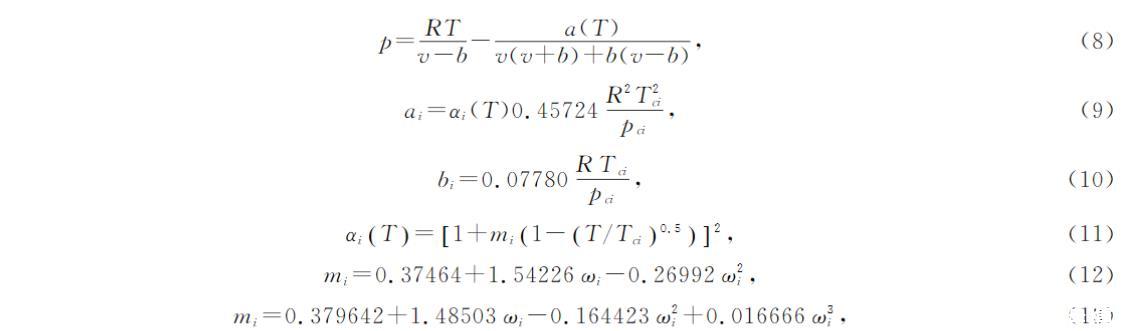 式中p為平衡壓力,單位是Pa;R為理想氣體常數(shù),單位是J/mol/K;T為溫度,單位是K;v為摩爾體積,單位是m3/mol;Tc為臨界溫度,單位是K;Pc為臨界壓力,單位是Pa;ω為偏心因子。