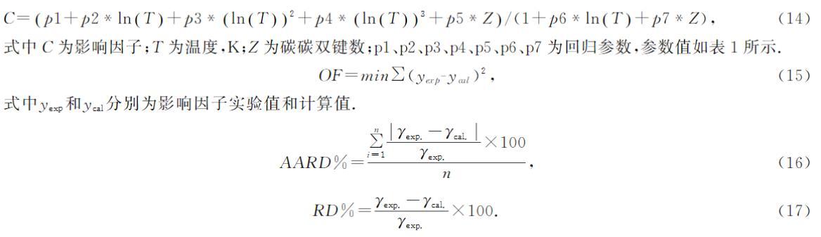 式中C為影響因子;T為溫度,K;Z為碳碳雙鍵數(shù);p1、p2、p3、p4、p5、p6、p7為回歸參數(shù),參數(shù)值如表1所示。