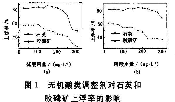 硫酸和磷酸是較為有效的膠磷礦抑制劑,工業(yè)應(yīng)用廣泛。考察傳統(tǒng)調(diào)整劑對(duì)石英和膠磷礦可浮性的影響,結(jié)果見圖1。
