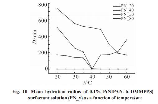 從Fig.10可以觀察到,低溫條件下,PN_20的平均水合半徑大約為500nm,PN_50的水合半徑在750nm左右。此階段,這2種聚合物均形成了膠束結(jié)構(gòu),并從水溶液中析出。當(dāng)溫度升高時,兩者的水合半徑均表現(xiàn)出明顯的減小趨勢,表明它們在水中的溶解度增加。特別地,對于PN_50而言,激光納米粒度儀的測量結(jié)果顯示,其水合半徑發(fā)生突變的溫度區(qū)間位于40℃至45℃之間。這一發(fā)現(xiàn)指出,PN_50在該溫度范圍內(nèi)經(jīng)歷了熱敏性質(zhì)的顯著變化,可能由于溫升引起的聚合物鏈構(gòu)象改變或膠束結(jié)構(gòu)的解離。相反,PN_40低溫時平均水合半徑接近于0,溶解性較好,而高溫時其水合半徑逐漸增大,接近400nm,從溶液中析出。其中PN_40所測得的LCST與透光率結(jié)果一致。隨著溫度升高,PN_20和PN_80分子在溶液中形成大的聚集體,激光粒度儀測定的是上清液的粒徑,因此粒徑變小,甚至觀察不到納米粒子。