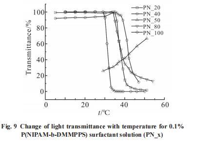 探究了P(NIPAN-b-DMMPPS)中PNIPAM嵌段含量對其臨界溶解溫度的影響,通過改變NIPAM與DMMPPS單體加料的比例,得到一系列PNIPAM嵌段含量不同的P(NIPAN-b-DMMPPS)嵌段共聚物。Fig.9為不同嵌段比例的表面活性劑溶液在500nm波長下的透光率隨溫度的變化。