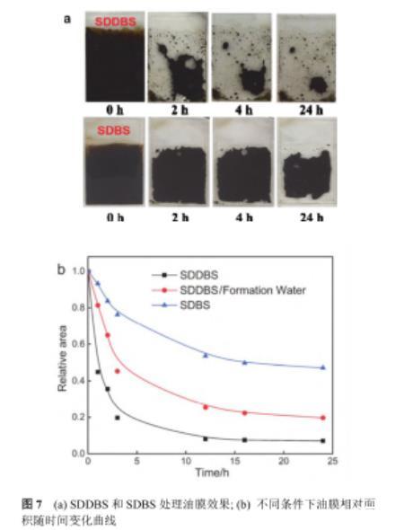 圖7(a)SDDBS和SDBS處理油膜效果;(b)不同條件下油膜相對面積隨時間變化曲線