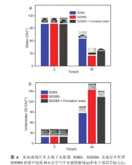 親油處理后玻璃片的空氣中水滴接觸角為100.2°,水下油滴接觸角為19.2°,為疏水親油性質(zhì).將親油玻璃片分別浸泡在0.02%(w)去離子水配置的SDBS、SDDBS溶液和地層水配置的SDDBS溶液中48 h,使用接觸角測量儀分別測量不同處理時間下其水滴接觸角及水下油滴接觸角.結(jié)果如圖6所示.SDDBS潤濕性調(diào)控能力較SDBS有較大提升,處理后空氣中水滴接觸角由65.1°降至24.5°,水下油滴接觸角由87.3°升至153.9°.經(jīng)SDDBS處理后的玻璃片呈現(xiàn)親水/水下強疏油性質(zhì).為探究鹽對界面潤濕調(diào)控性能的影響,使用地層水配置的SDDBS溶液處理親油玻璃片,結(jié)果表明處理后空氣中水滴接觸角為35.6°,水下油滴接觸角為133.6°,說明地層水的引入降低了SDDBS對親油表面的親水疏油調(diào)控效果.這是由于地層礦化度條件下,SDDBS分子鏈團聚影響界面吸附,導(dǎo)致潤濕調(diào)控能力略有下降.