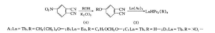 酞酞菁及其金屬配合物因具有較高的化學(xué)穩(wěn)定性、半導(dǎo)體、光導(dǎo)、光伏及氣敏性而受到重視。近年來,稀土雙酞酞菁化合物的研究也有報道。Maskalev等首次發(fā)表稀土雙酞酞菁衍生物的合成及其成膜性,劉云圻等人報道了稀土雙酞酞菁衍生物的合成和電化學(xué)特性,Aroca等又報道了雙酞酞菁鈰及其LB膜吸附氮氧化物及其表面增強拉曼和紫外-可見光譜特性,但有關(guān)這類衍生物未見有良好熒光性的報道。我們合成了4種新型稀土雙酞酞菁衍生物,測定了它們在溶液和LB膜狀態(tài)下的熒光特性,并對鄰菲咯啉摻雜形成的混合LB膜進行了研究。