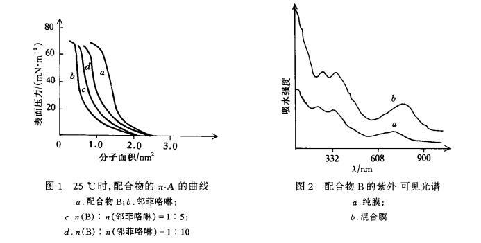 將稀土雙酞酞菁衍生物配成濃度為0.1g/L的氯仿溶液,按照不同的摩爾比將鄰菲咯啉加入溶液中。樣品槽和基片在索氏提取器中用異丙醇回流數(shù)小時后,分別用氯仿、甲醇、純水超聲10min。在KSV-5000雙層拉膜機上,用微量進樣器,將溶液小心滴加到清潔的水面上,待氯仿完全揮發(fā)后,進行π-A曲線測定。LB膜的組裝,表面壓力均為20mN/m,提拉速度為5mm/min,用垂直拉膜法,以Y型沉積方式,在石英基片上,制成不同層數(shù)的LB膜。該膜用于紫外-可見和熒光輻射測量(狹縫長2mm,激發(fā)波長375nm)。