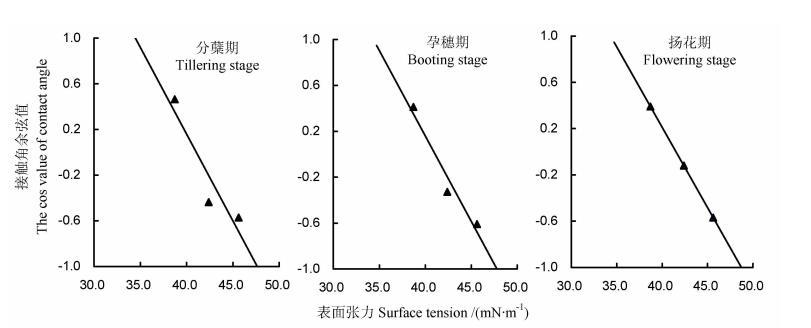 通過(guò)Delta-8表面張力儀直接測(cè)定,分蘗蘗期、孕穗期、揚(yáng)花期水稻葉片的臨界表面張力值分別為34.46、34.36和34.33 mN/m。結(jié)果如圖2所示,清晰展示了不同生育期的差異。