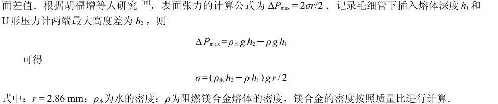 工業純Mg熔化后在750℃左右加入Mg-30%Ca和Mg-30%Ce中間合金,待金屬完全熔化后攪拌均勻,去除表面熔渣,保溫10 min后進行表面張力的測量.測量時首先打開氬氣瓶,通過一系列的量程裝置、U形管兩邊液面波動情況和熔體中產生氣泡的速度來調節氣體流量大小,以阻燃鎂合金熔體表面每分鐘產生8~10個氣泡為準。記錄下毛細石英管插入到熔體內部的深度和U形管兩端的最大液面差值。