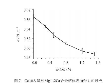 稀土元素Ce是表面活性元素,很容易富集到鎂合金熔體表面,這種表面富集現象極大地影響了鎂合金熔體氧化膜結構及其阻燃性能.表面張力是一個重要的高溫熔體物理屬性,可以很好地反映Ce元素在阻燃鎂合金熔體表面的富集狀況,從而為研究阻燃鎂合金機理提供了另外一種直觀的理論依據.