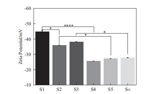 在我們的研究中,測量了Zeta電位,如圖6所示。對于SLES體系(S1-S3),S1表現(xiàn)出最負(fù)的Zeta電位,其次是S3,而S2的Zeta電位最小。對于SMCT體系(S4-S6),它們之間的Zeta電位沒有顯著差異。比較SLES和SMCT體系時(shí),可以觀察到SMCT體系的Zeta電位低于SLES體系。此外,在S1和S4、S2和S5以及S3和S6之間發(fā)現(xiàn)了顯著差異。