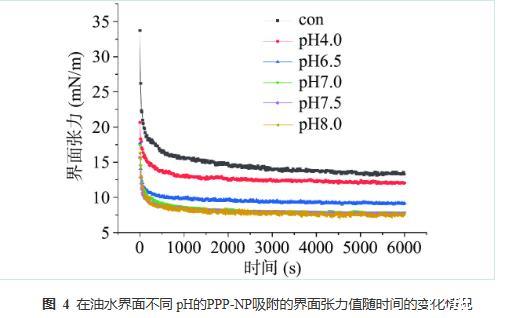 由于從乳液界面去除吸附顆粒需要巨大的解吸能量,因此顆粒的界面吸附被認(rèn)為是一個(gè)不可逆的過程。PPP-NP在油-水界面的吸附可能包括至少兩個(gè)階段:第一階段PPP-NP接近乳液界面并滲透到油-水界面,第二階段顆粒附著在界面,導(dǎo)致粘彈性界面膜的形成。由于乳化劑的界面特性是評(píng)估其穩(wěn)定乳液能力的關(guān)鍵因素,因此測(cè)定了不同pH條件下PPP-NP的界面張力的變化。