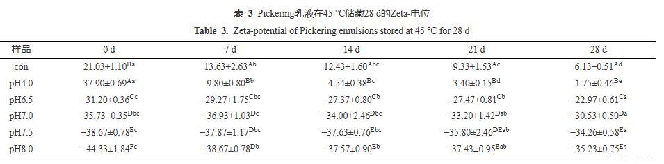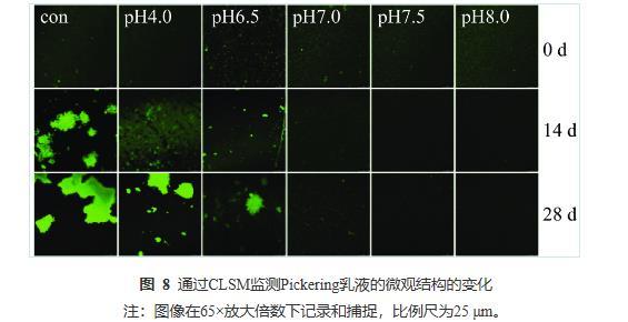 由圖8可知,當(dāng)儲藏14 d時,Con、pH4.0的乳液均出現(xiàn)大面積的油滴聚集,pH6.5的乳液出現(xiàn)局部小聚集,而pH7.0~8.0的乳液微觀結(jié)構(gòu)顯示其分布仍然均勻,無任何油滴聚集現(xiàn)象。當(dāng)儲藏28 d后,Con、pH4.0、pH6.5的乳液中聚集程度明顯加強,pH7.0的乳液也有較微弱的局部小聚集現(xiàn)象;而pH7.5與pH8.0的乳液仍保持良好的分布狀態(tài),這與圖7的視覺直觀圖、表2粒徑監(jiān)測和表3電位監(jiān)測的結(jié)果保持一致。CLSM的結(jié)果再次證實PPP-NP穩(wěn)定的乳液酸性條件下的長期穩(wěn)定性較差,在中性和堿性條件下有著更好的乳液穩(wěn)定性。這一結(jié)果與He等的結(jié)果相似,其所制備的樣品同樣在堿性條件下穩(wěn)定性更高。